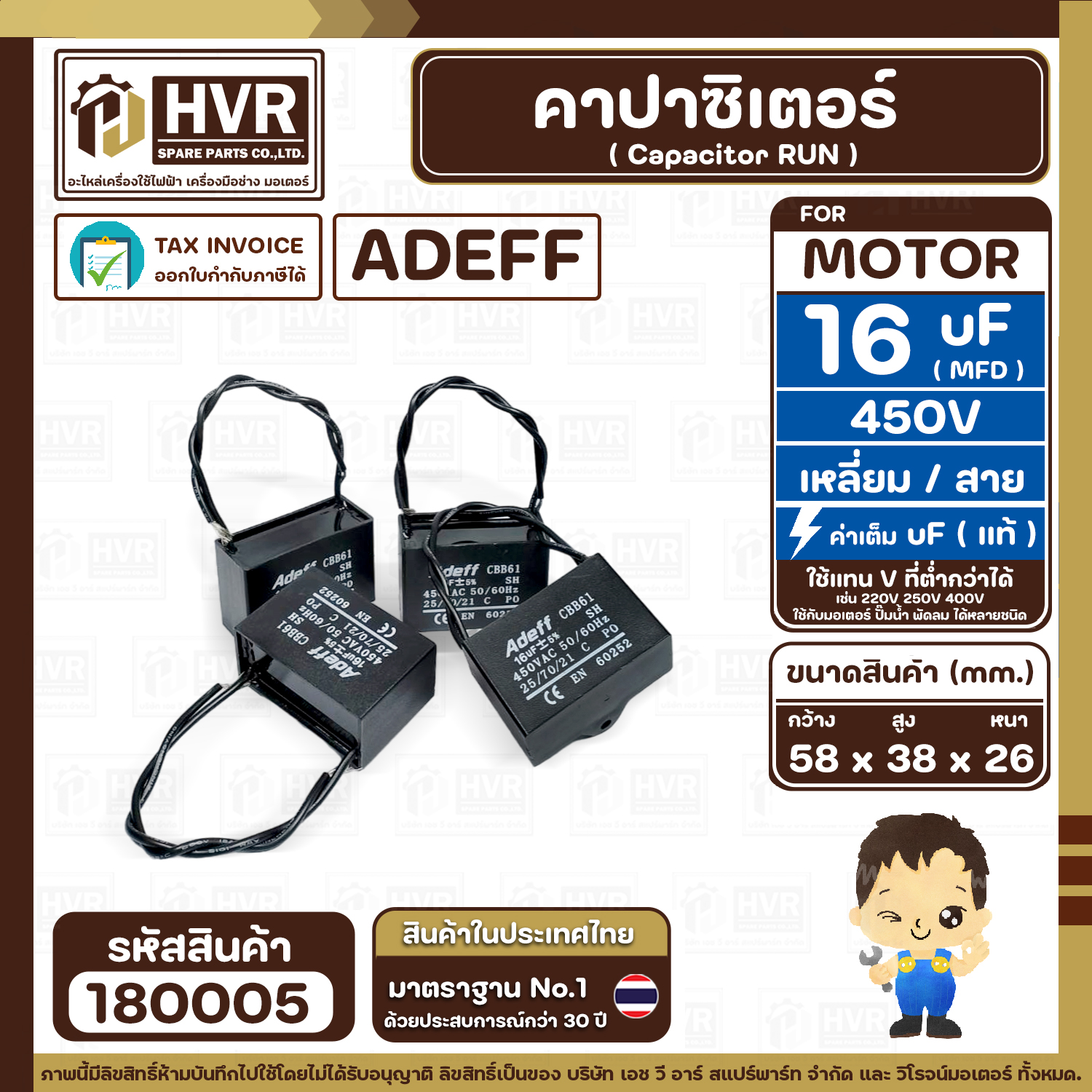 > อะไหล่มอเตอร์ > คาปาซิเตอร์ (RUN ) > คาปาซิเตอร์ ( Cap Run ) 16 uF 450V ( เหลี่ยม สาย ) ( Adeff ) ( 38 x 58 x 26 mm.)