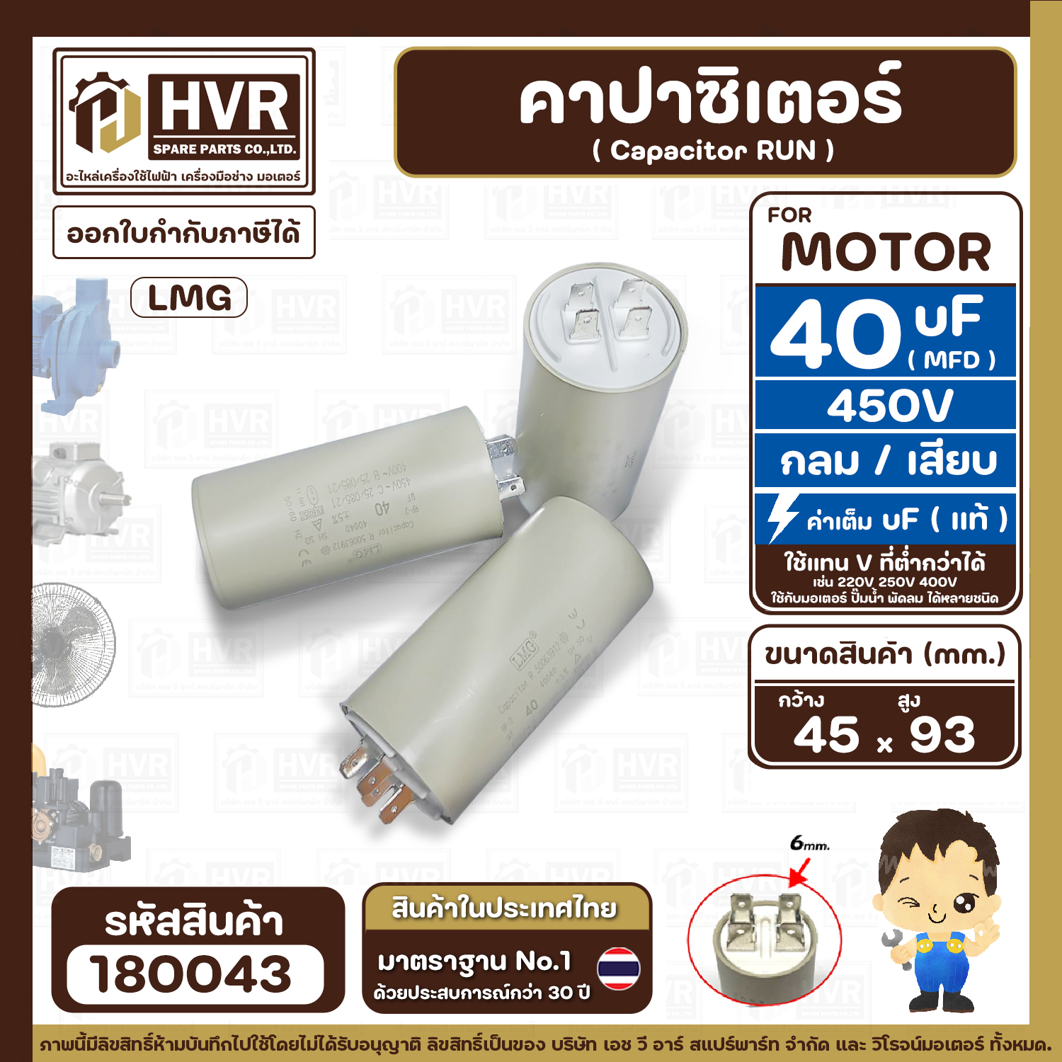 > อะไหล่มอเตอร์ > คาปาซิเตอร์ (RUN ) > คาปาซิเตอร์ ( Cap Run ) 40 uF 450V ( กลม แบบเสียบ ) ( LMG ) ( 45 x 93 mm. )