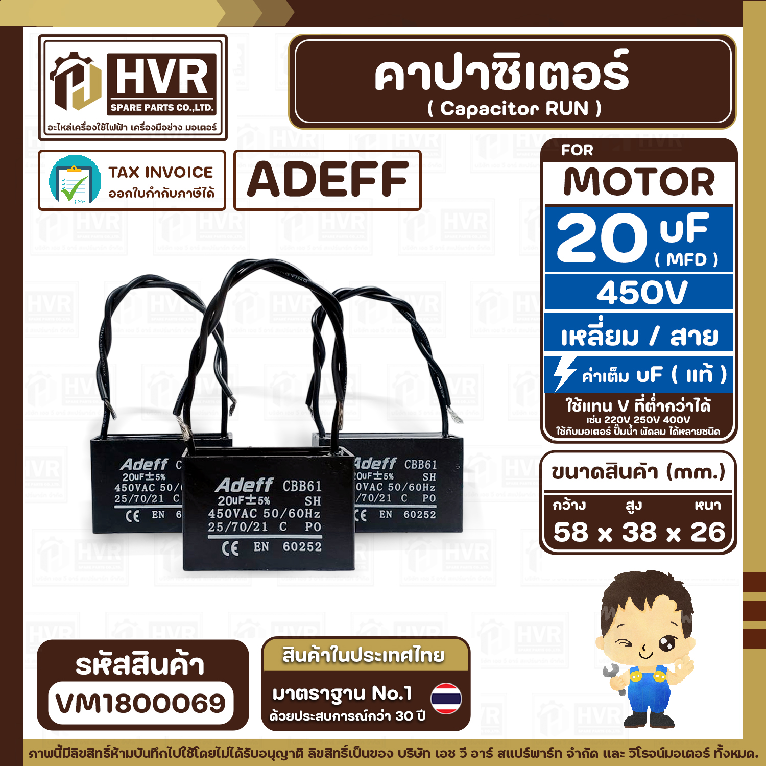 > อะไหล่มอเตอร์ > คาปาซิเตอร์ (RUN ) > คาปาซิเตอร์ ( Cap Run ) 20 uF 450V ( เหลี่ยม สาย ) ( Adeff ) ( 38 x 58 x 26 mm.)