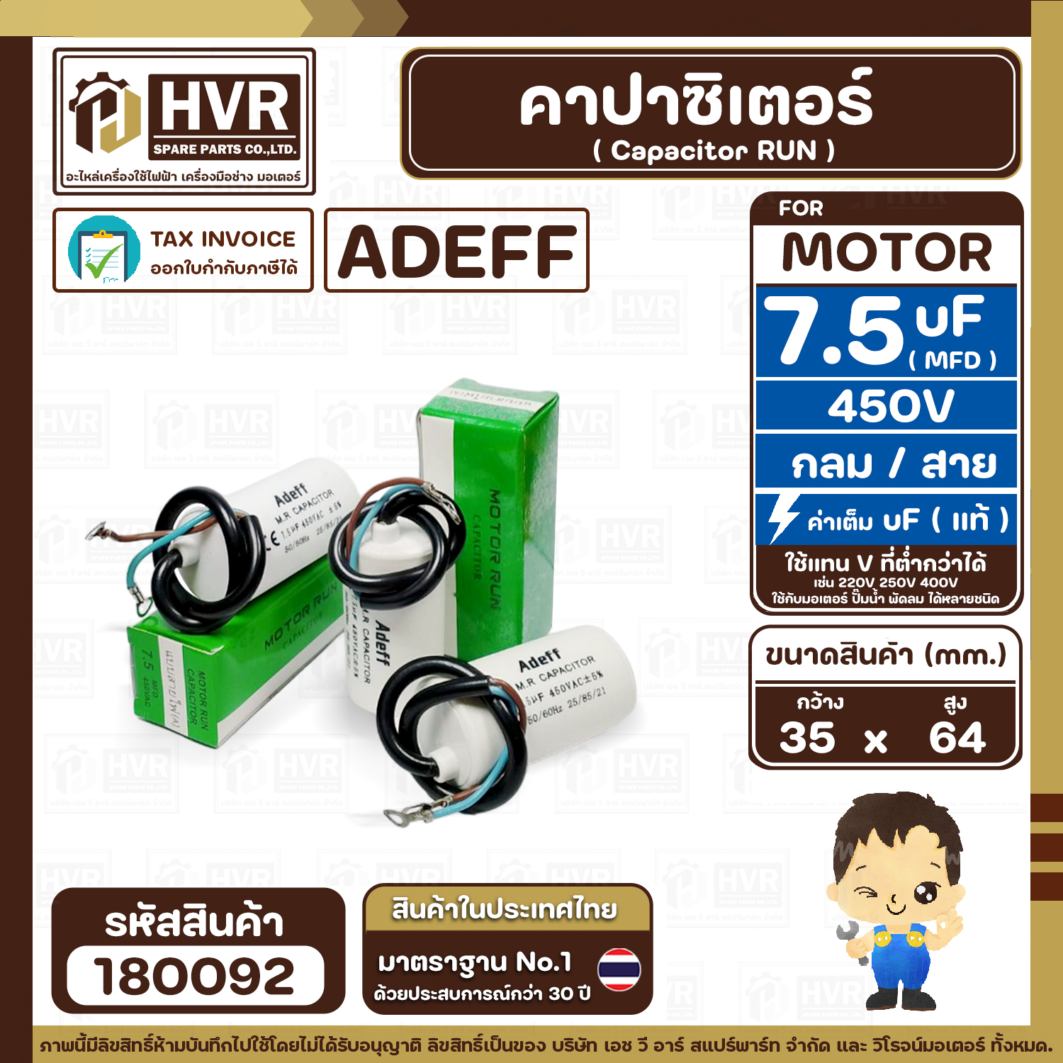 คาปาซิเตอร์ ( Cap Run ) 7.5 uF ( MFD ) 450V ( กลม สาย ) ( Adeff ) ( 35 x 64 mm.) #1800092