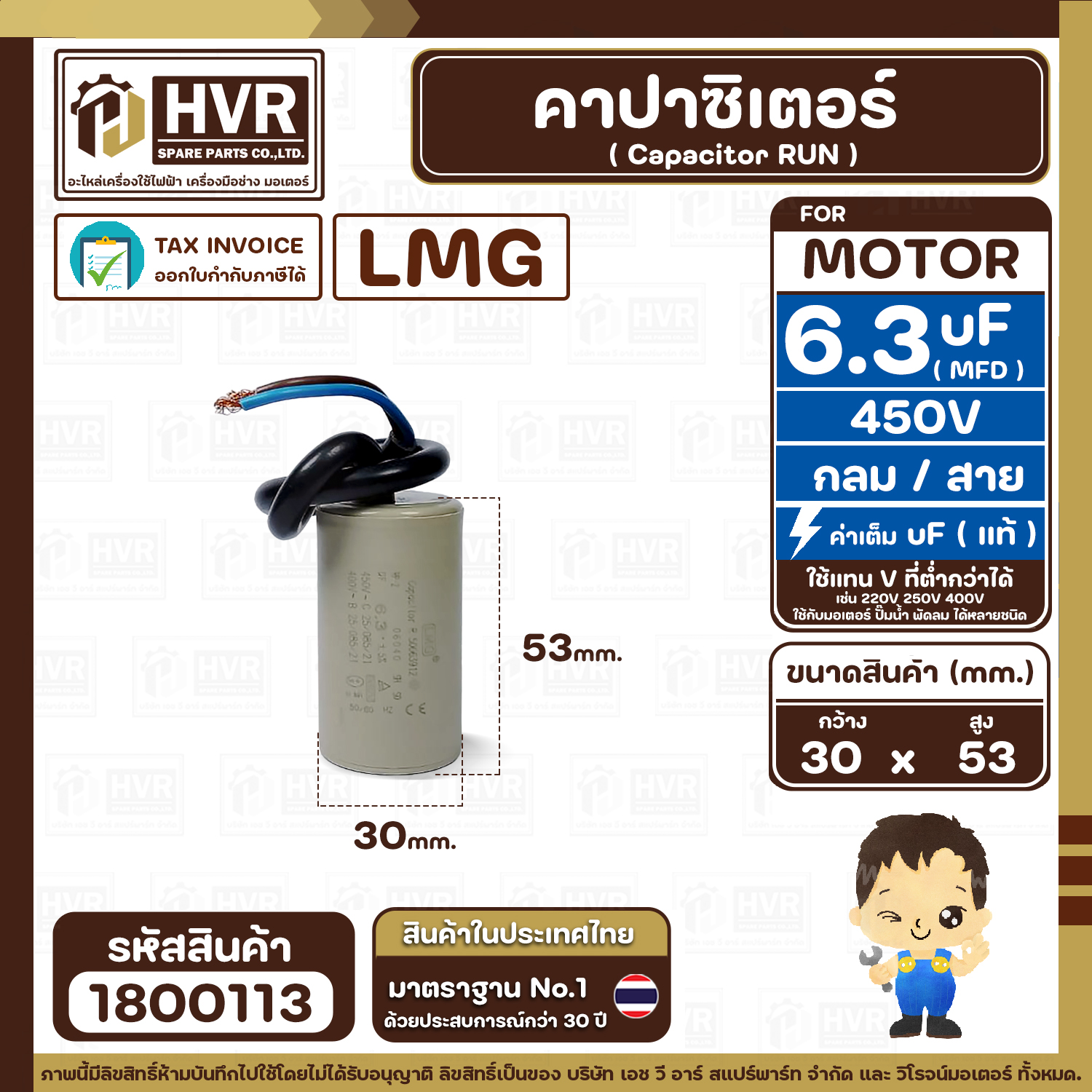 คาปาซิเตอร์ ( Cap Run ) 6.3 uF ( MFD ) 450V ( กลม สาย ) ( LMG ) ( 30 x 53 mm.) #1800113