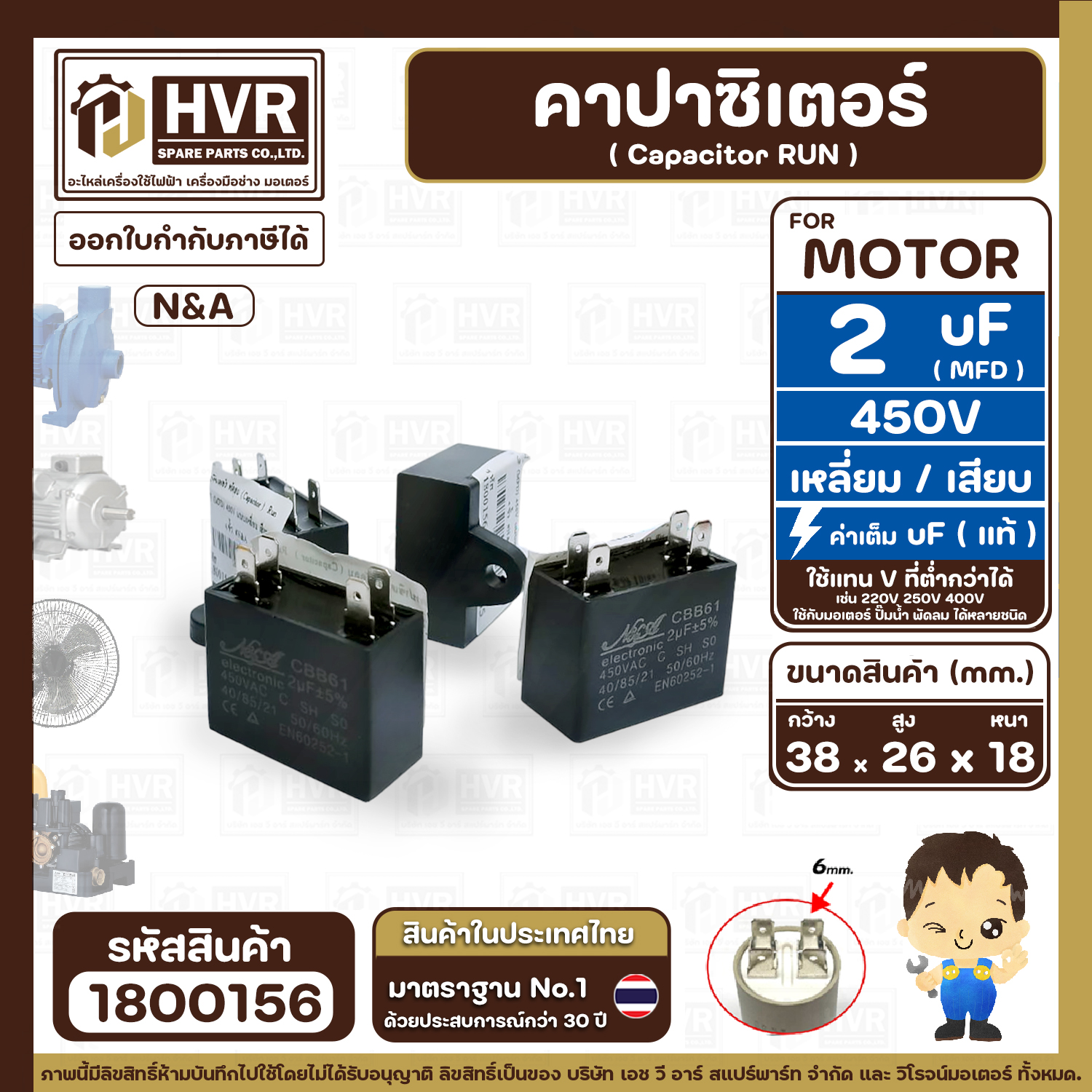 คาปาซิเตอร์ ( Capacitor Run ) 2 uF ( MFD ) 450V ยี่ห้อ N&A ( เหลี่ยม แบบเสียบ 4 ขั่ว ) ( 18 x 26 x 38 mm. ) ( 1 ตัว ) #1800156