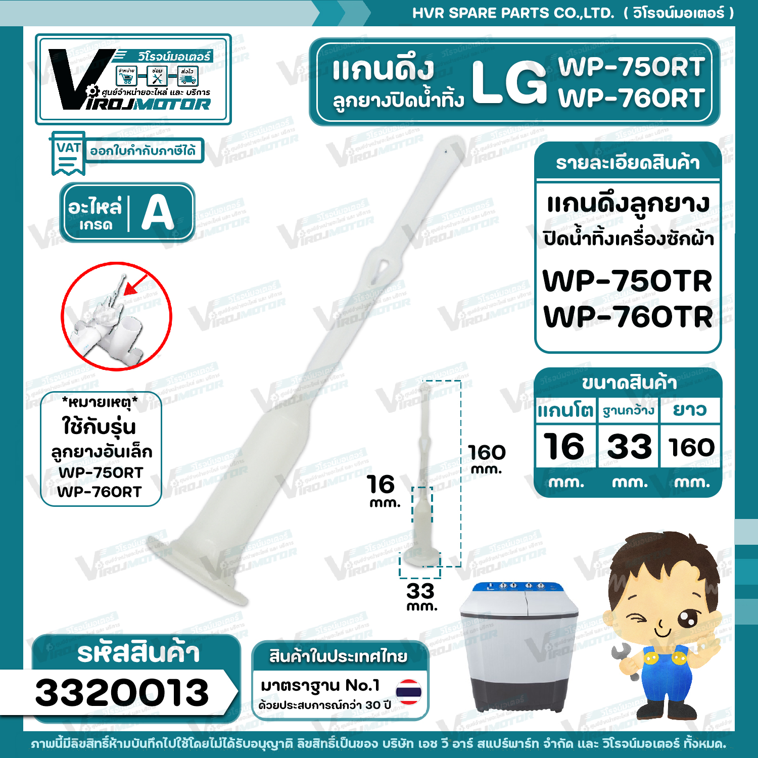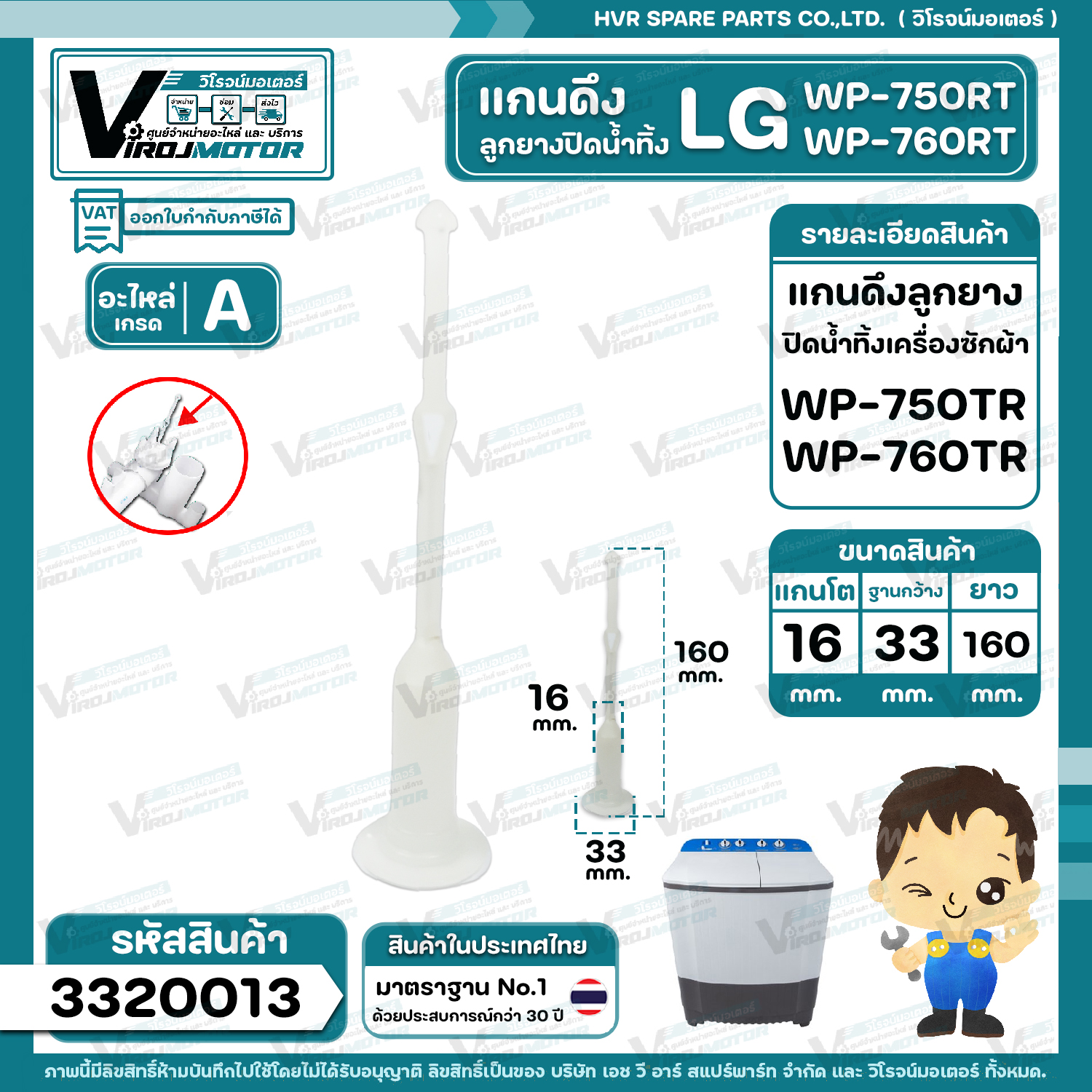 สายดึงลูกยางปิดน้ำทิ้ง LG WP-750RT , WP-760RT ( ใช้กับลูกยางเล็กเท่านั้น ) ( แกนโต 16 mm. x ฐาน 33 mm. ยาว 160 mm.) #3320013
