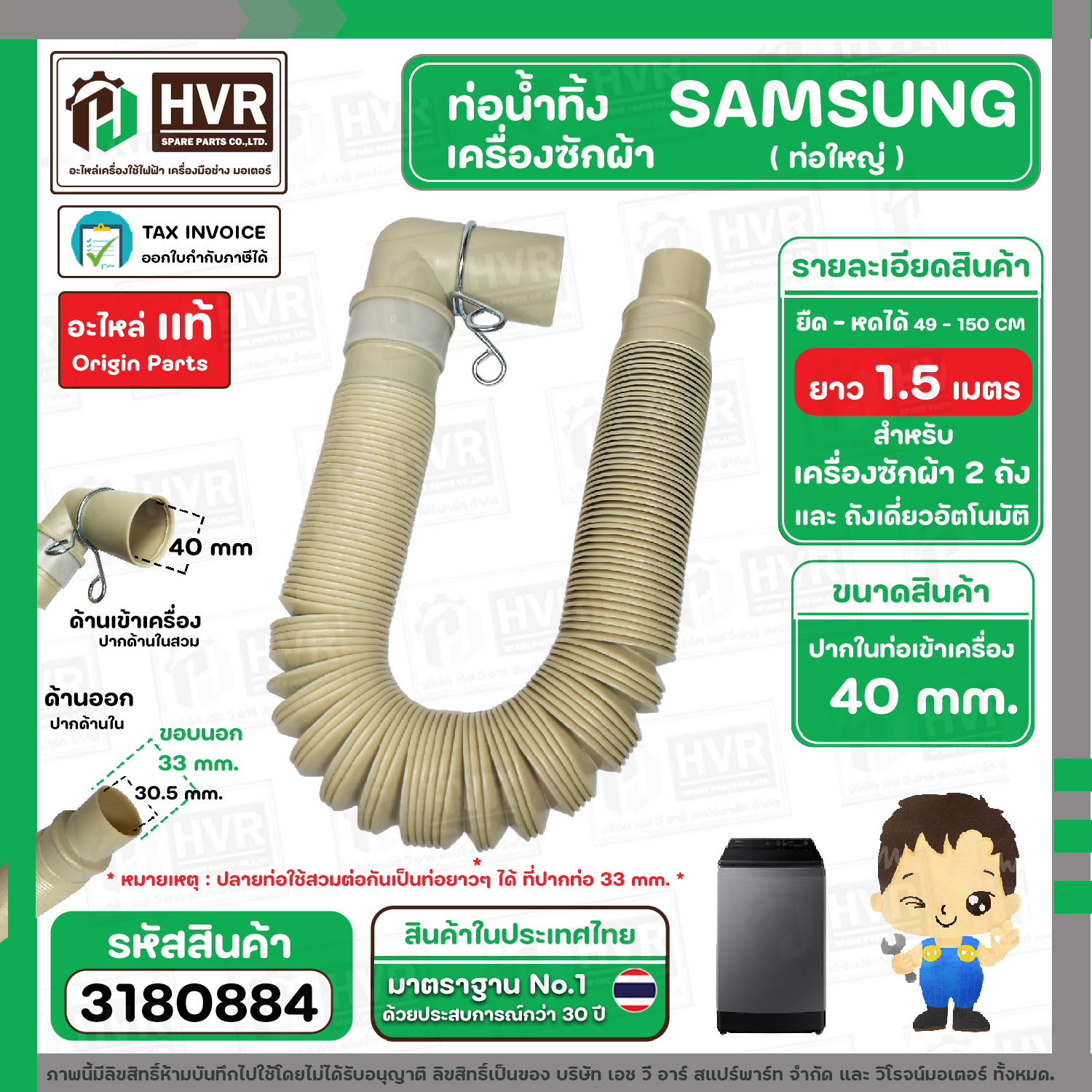 ท่อน้ำทิ้งเครื่องซักผ้า SAMSUNG ( ท่อใหญ่ ) ( หัวงอ 90 องศา ) ยืด-หดได้ ยาว 0.5 เมตร-1.5 เมตร ปากท่อด้านใน 40 mm.HOSE DRAIN SAMSUNG ( แท้ ) #3180884