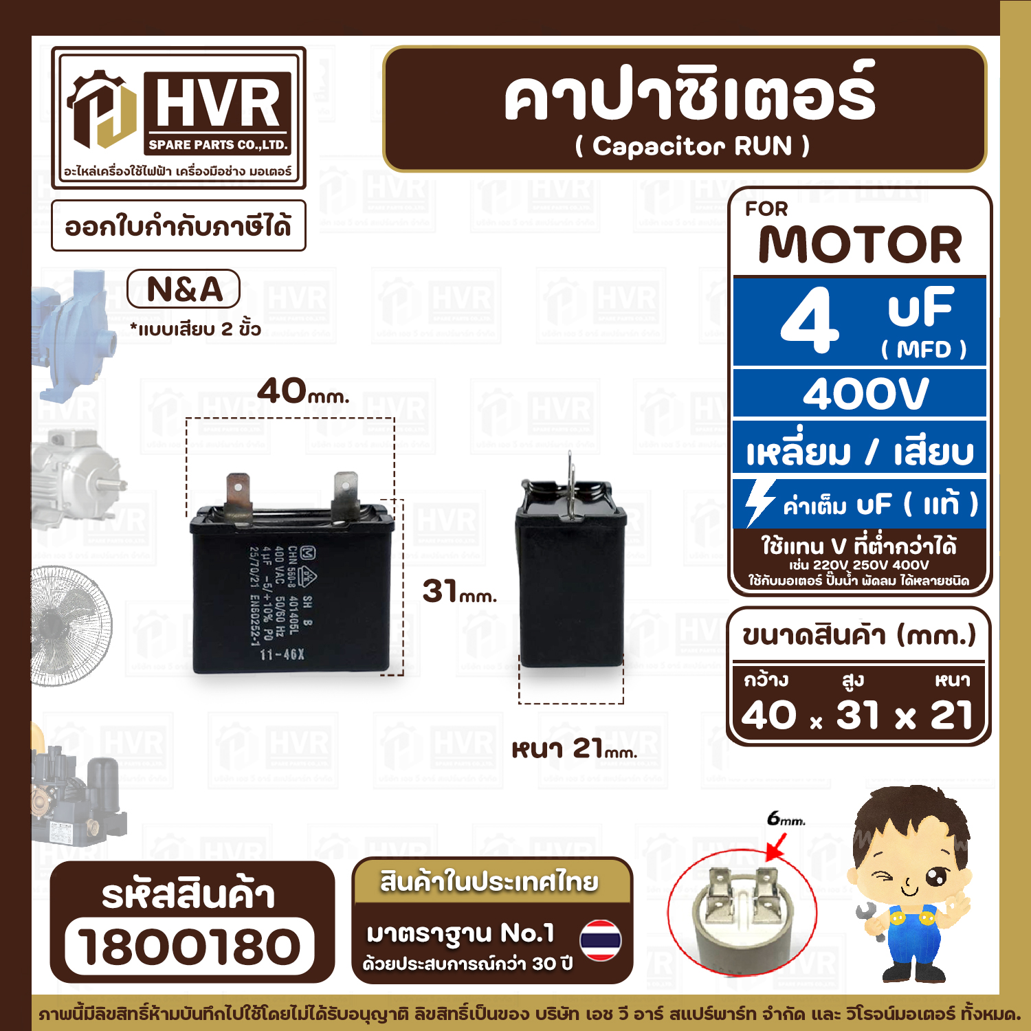คาปาซิเตอร์ ( Capacitor Run ) 4 uF ( MFD ) 400V ยี่ห้อ N&A ( เหลี่ยม แบบเสียบ 2 ขั่ว ) ( 21 x 31 x 40 mm.) #1800180