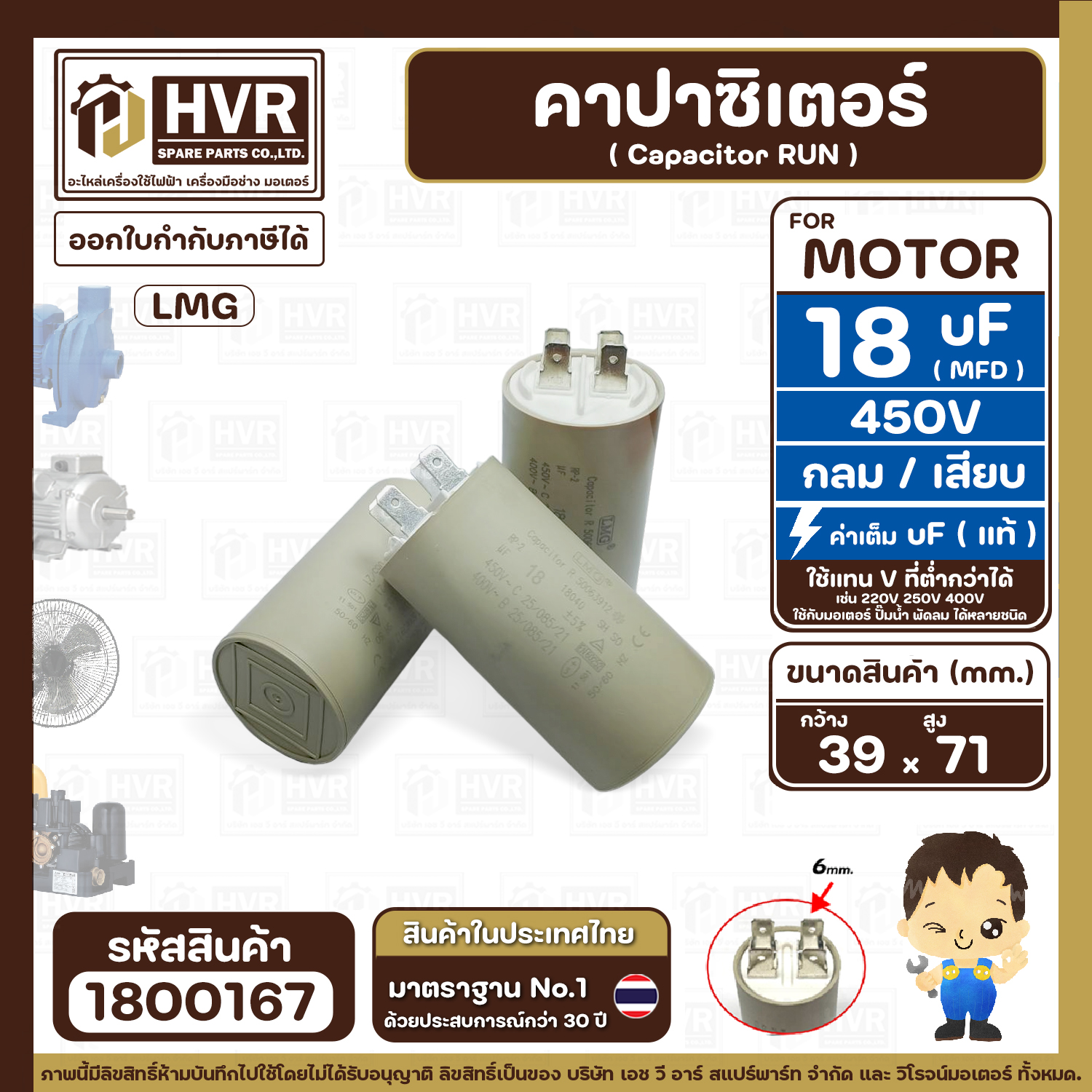 คาปาซิเตอร์ ( Cap Run ) 18 uF 450V ( กลม แบบเสียบ ) ( LMG ) ( 39 x 71 mm. ) #1800167