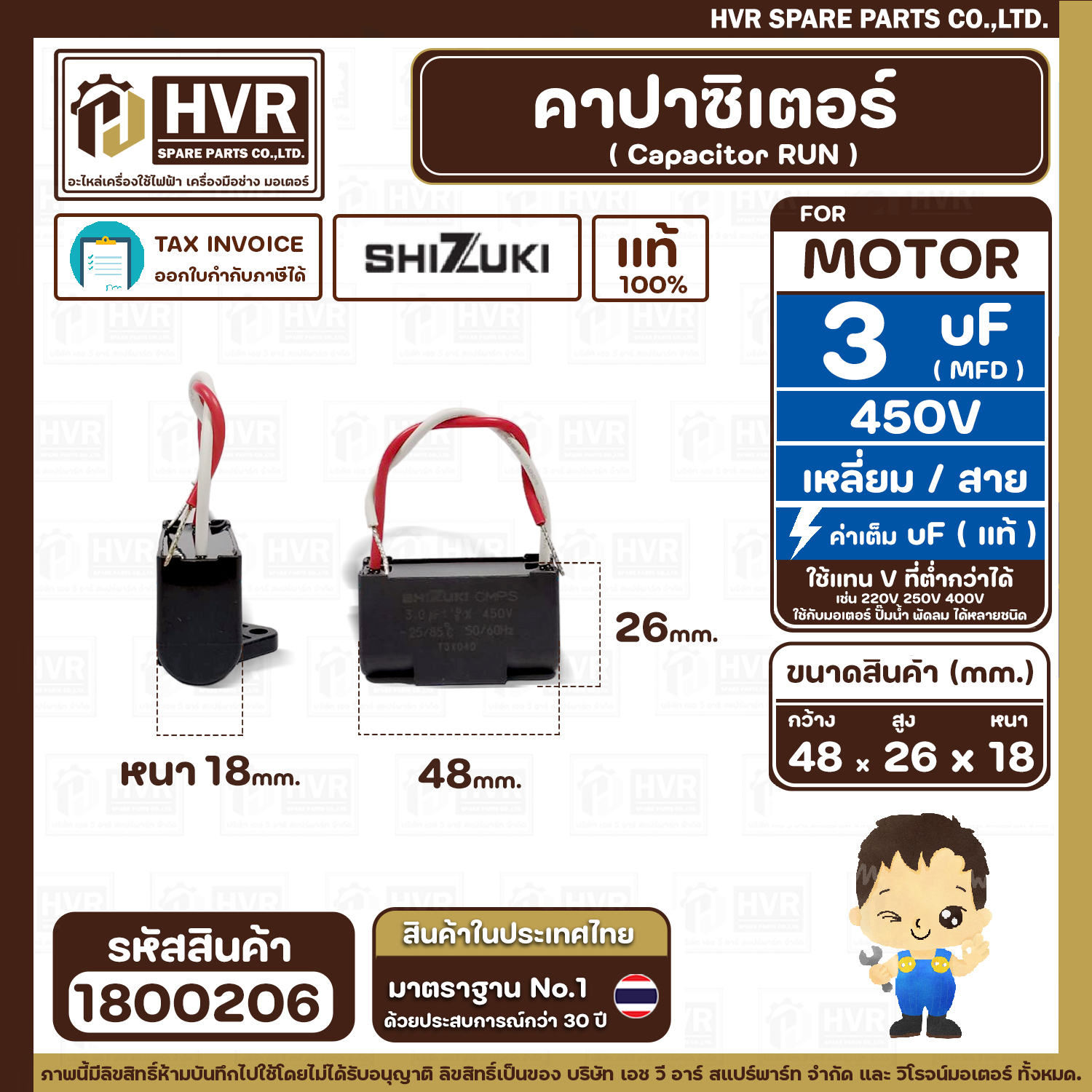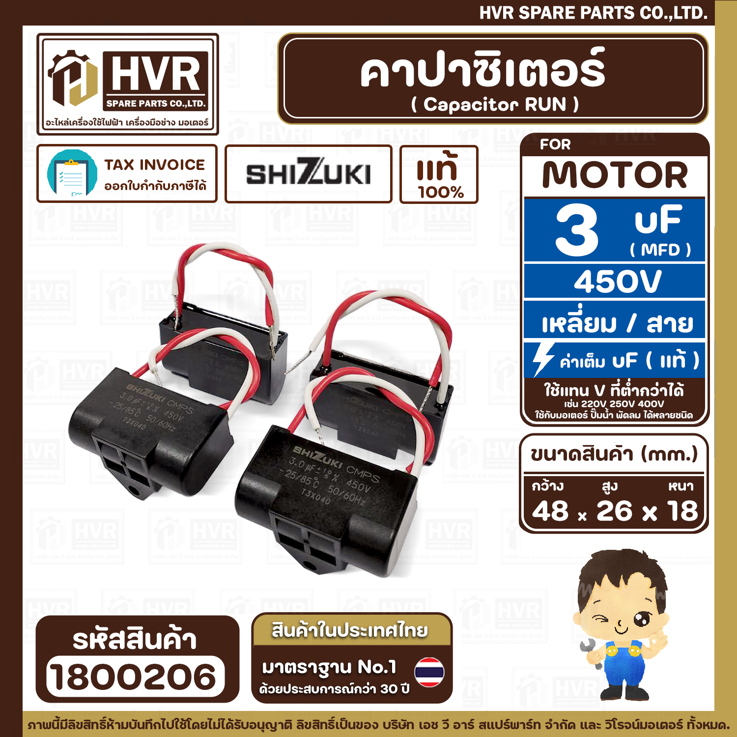 > อะไหล่มอเตอร์ > คาปาซิเตอร์ (RUN ) > คาปาซิเตอร์ ( Cap Run ) 3 uF 450V ( เหลี่ยม สาย ) ( SHIZUKI ) ( แท้ ) ( 26 x 48 x 18 mm. )