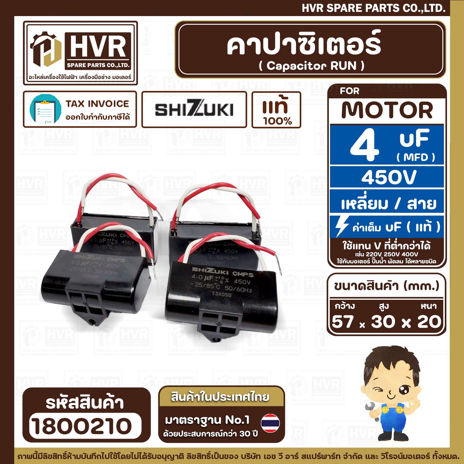 > อะไหล่มอเตอร์ > คาปาซิเตอร์ (RUN ) > คาปาซิเตอร์ ( Cap Run ) 4 uF 450V ( เหลี่ยม สาย ) ( SHIZUKI ) ( แท้ ) ( 30 x 57 x 20 mm.)
