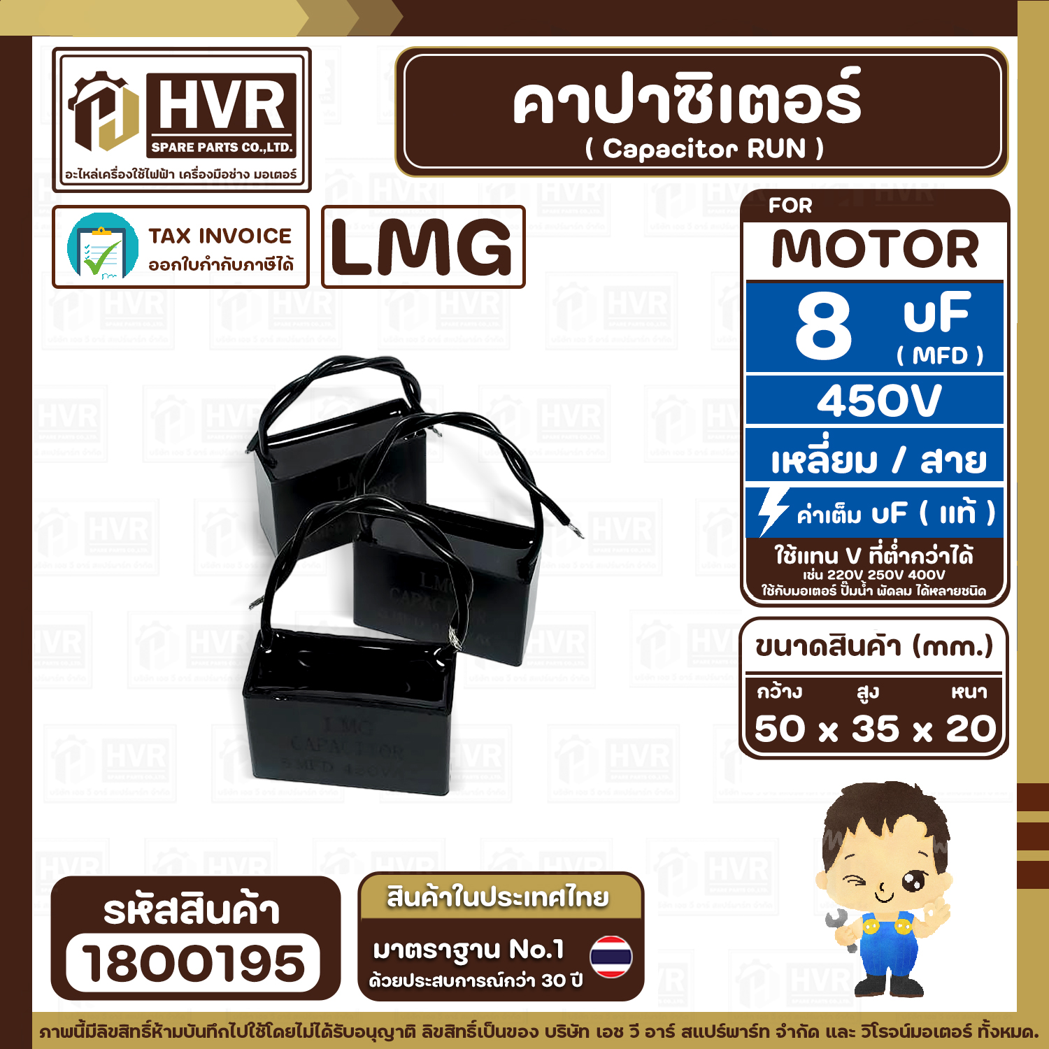 > อะไหล่มอเตอร์ > คาปาซิเตอร์ (RUN ) > คาปาซิเตอร์ ( Cap Run ) 8 uF 450V ( เหลี่ยม สาย ) ( LMG ) ( 35 x 50 x 20 mm.)