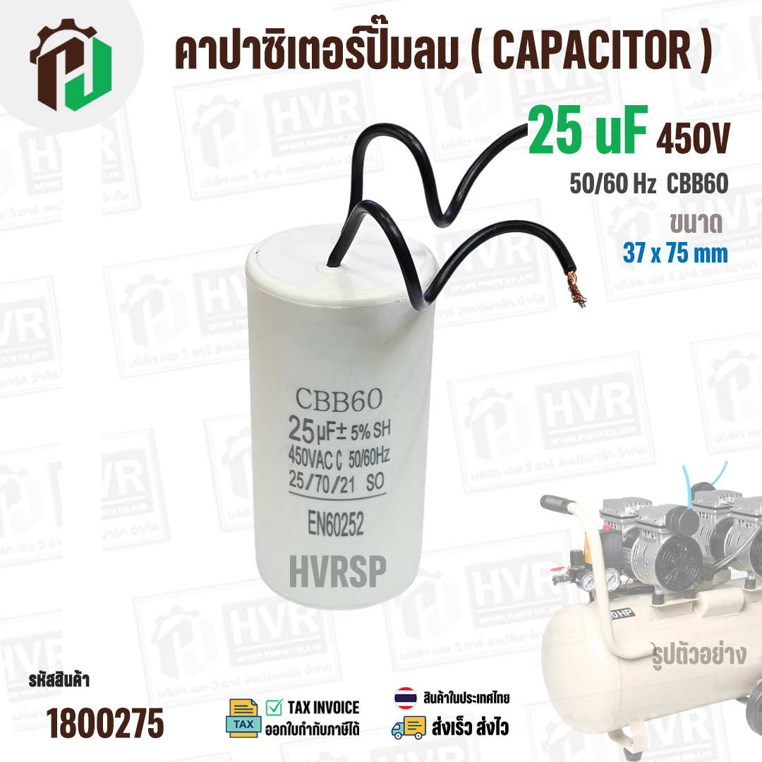 คาปาซิเตอร์ปั๊มลมออยฟรี 25 uF 450V ( กลม สาย ) ( CCB60 ) ( 38 x 75 mm ) #1800275