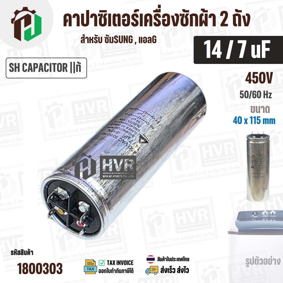 คาปาซิเตอร์เครื่องซักผ้า 14 / 7 uF 450V ( SH CAPACITOR )( อลูมิเนียม กลม เสียบ) ( 40 x 115 mm ) ( แท้ ) #1800303