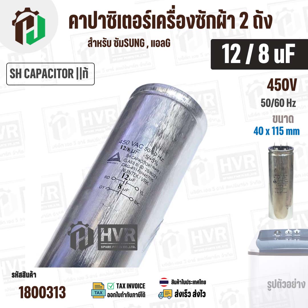 คาปาซิเตอร์เครื่องซักผ้า 12 / 8 uF 450V ( SH CAPACITOR )( อลูมิเนียม กลม เสียบ) ( 40 x 115 mm ) ( แท้ ) #1800313