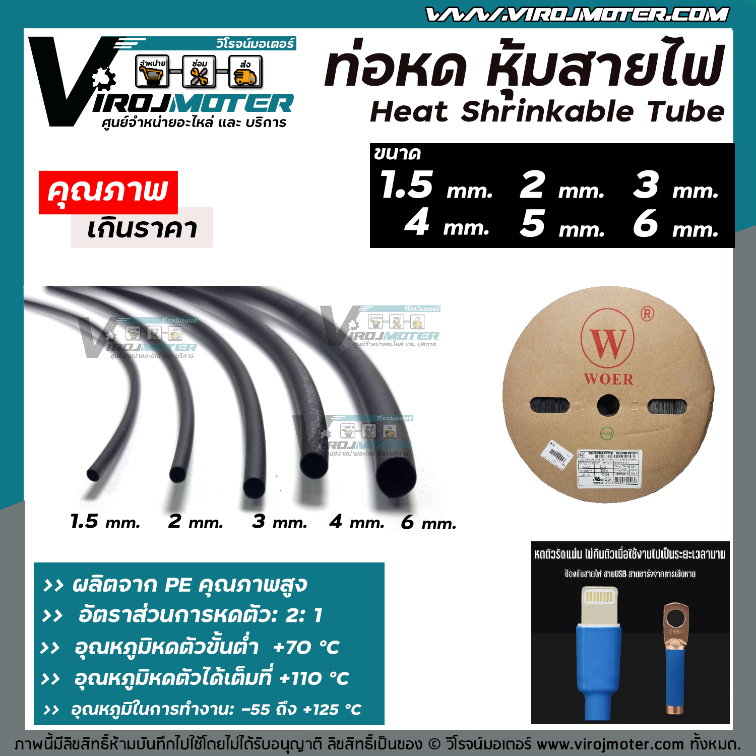 >> Premium Grade A (พรีเมี่ยมเกรดเอ) <<>> ผลิตจาก PE คุณภาพสูง เป็นมิตรกับสิ่งแวดล้อม มีความยืดหยุ่นสูง ทนทาน กันน้ำ ใช้งานง่าย>> อัตราส่วนการหดตัว: 2: 1 (จะหดไป 1/2 ของเส้นผ่าศูนย์กลาง)>> อุณหภูมิหดตัวขั้นต่ำ +70 องศาเซลเซียส>> อุณหภูมิหดตัวได้เต็มที่ +110 องศาเซลเซียส>> อุณหภูมิในการทำงาน: -55 ถึง +125 องศาเซลเซียส>> ข้อกำหนดการผลิต: UL>> ขนาด 1.5 mm. / 2.0 mm. / 3.0 mm. / 4.0 mm / 5.00 mm. / 6.00 mm.>> สีดำ