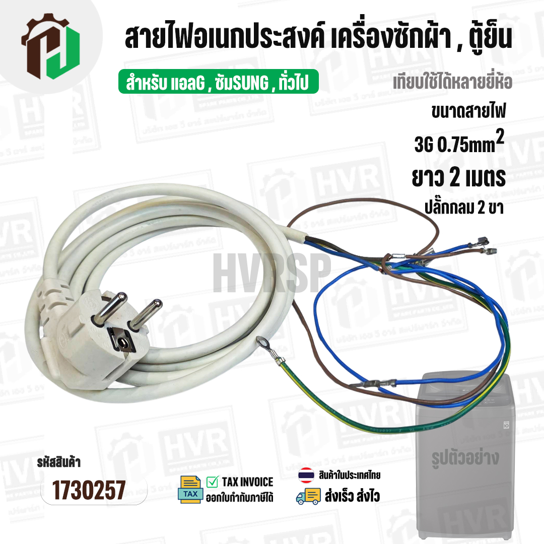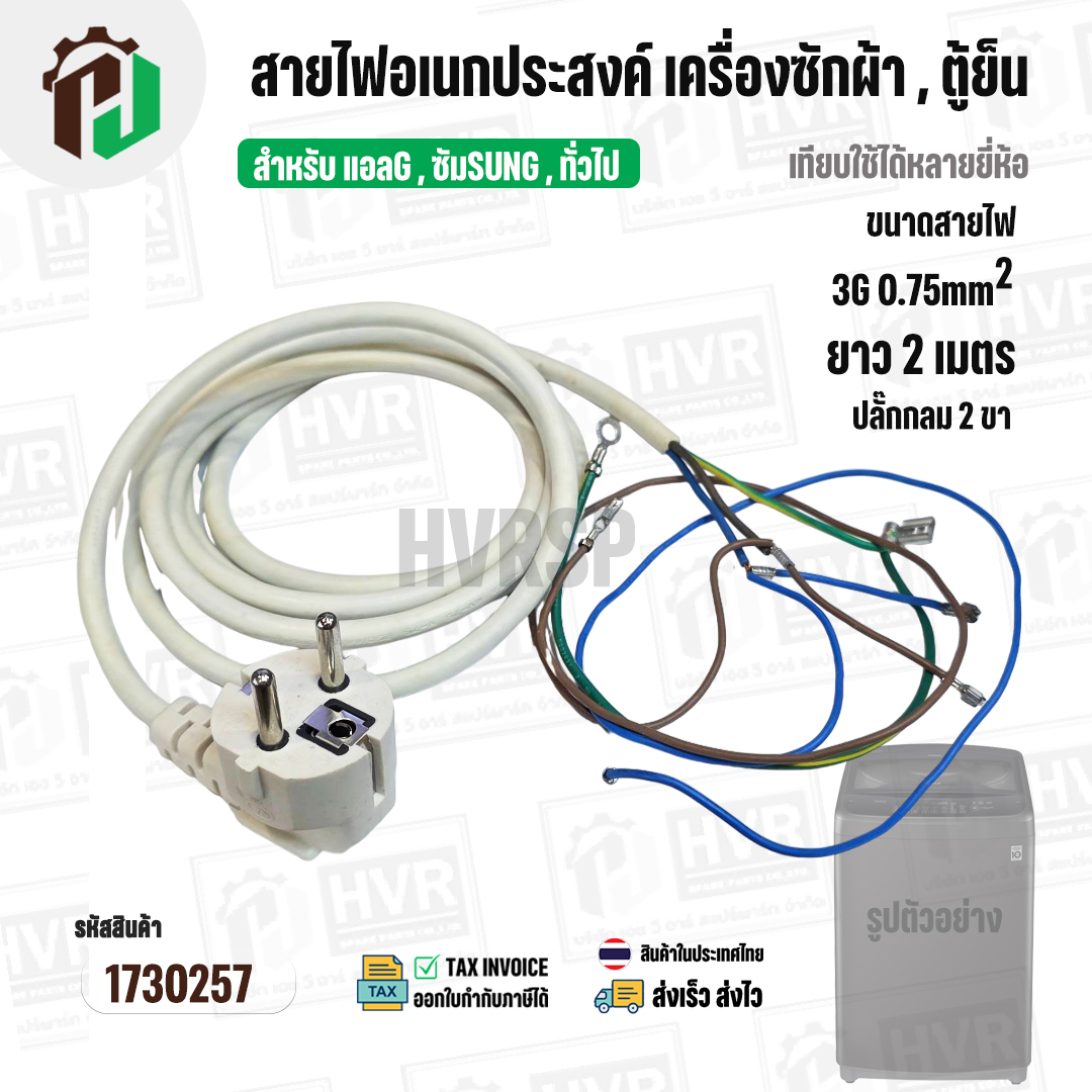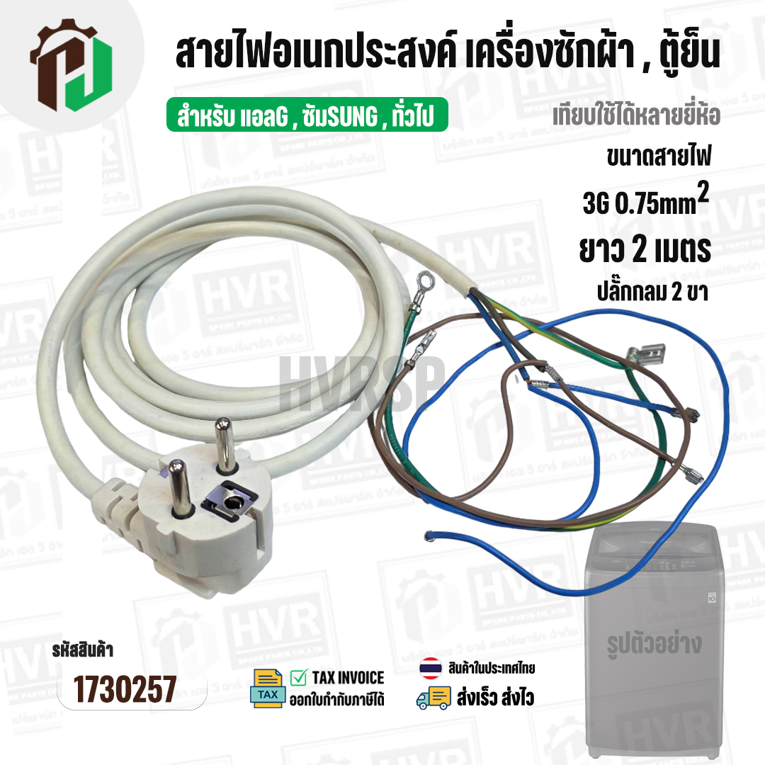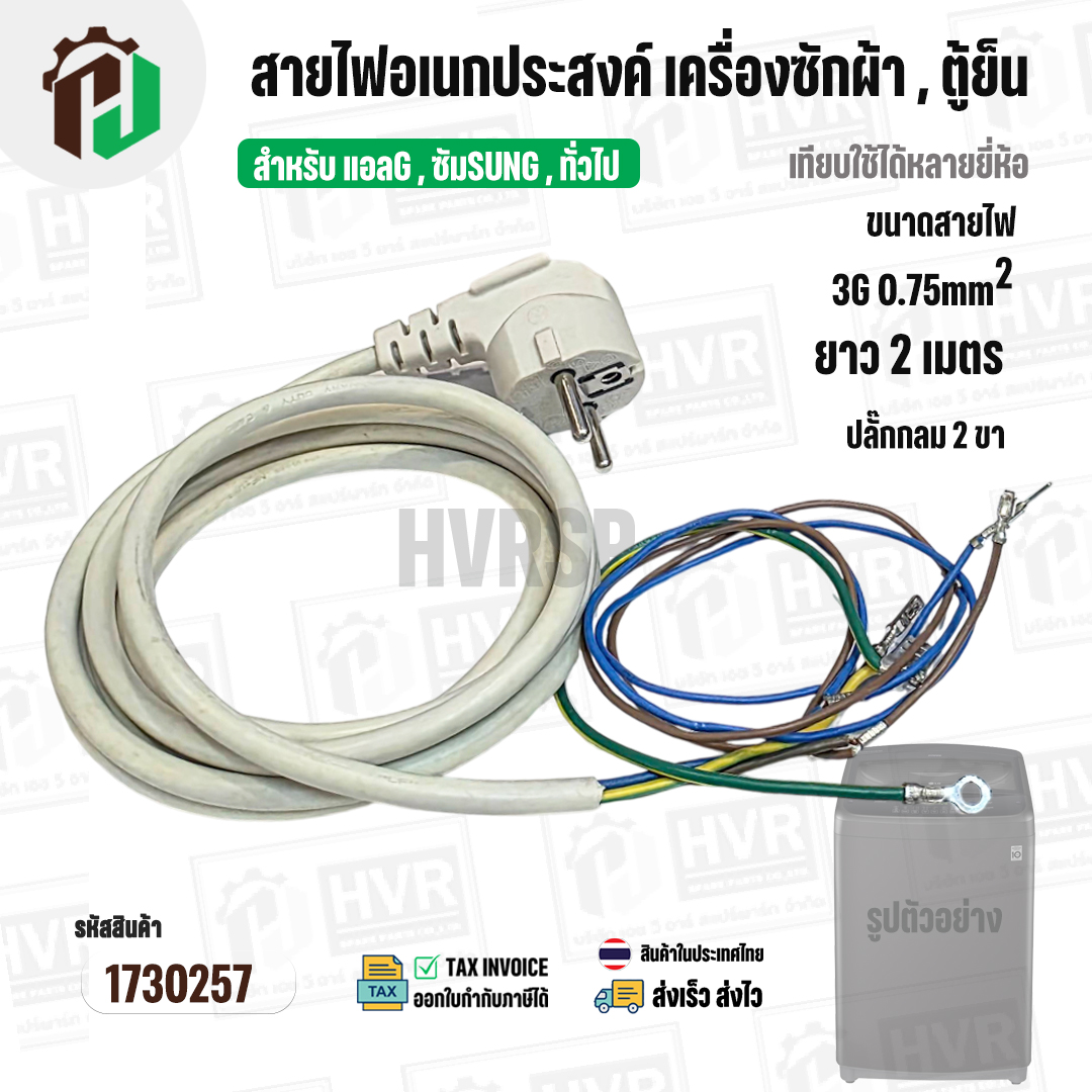 สายไฟ AC สำเร็จรูปอเนกประสงค์ สำหรับเครื่องซักผ้า , ตู้เย็น และ ทั่วไป พร้อมปลั๊ก 2 ขา กลม ( สีขาว ) 3 x 0.75sq. mm x ยาว 2 เมตร #1730257