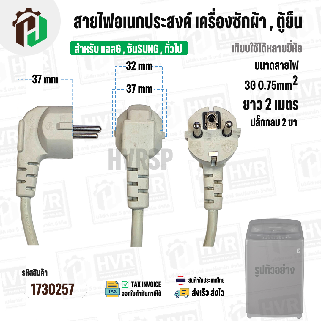 > อะไหล่เครื่องมือช่าง > สายไฟ > สายไฟ AC สำเร็จรูปอเนกประสงค์ สำหรับเครื่องซักผ้า , ตู้เย็น และ ทั่วไป พร้อมปลั๊ก 2 ขา กลม ( สีขาว ) 3 x 0.75sq. mm x ย