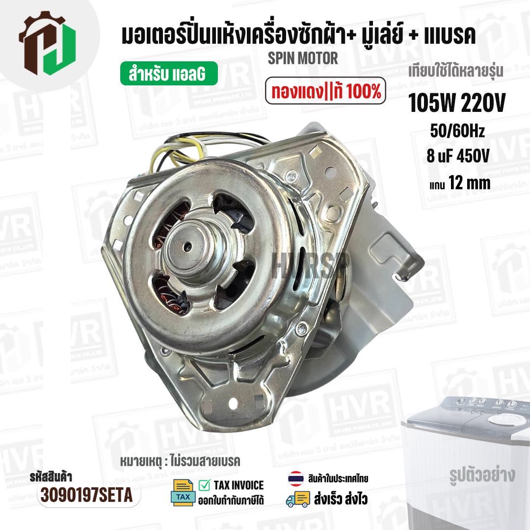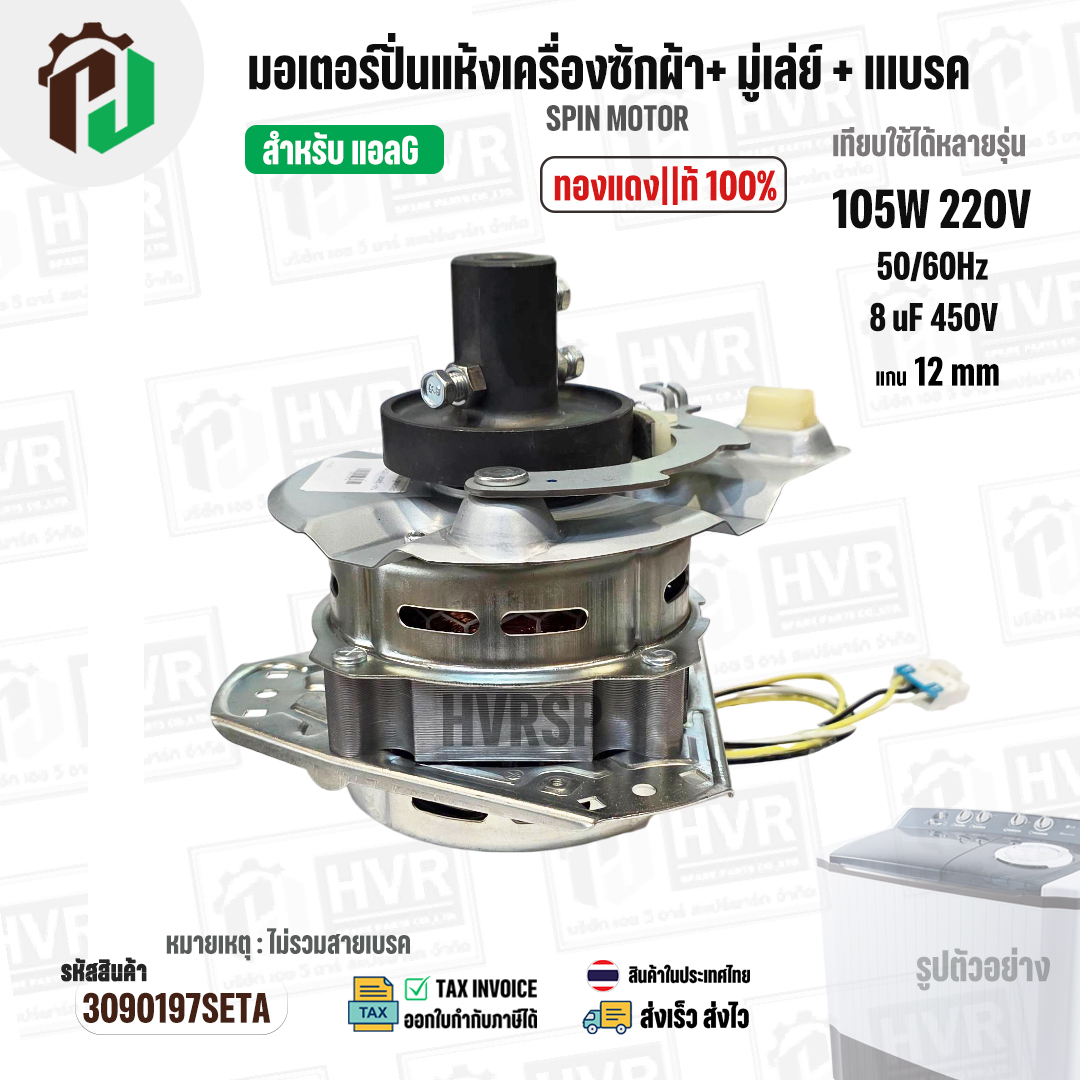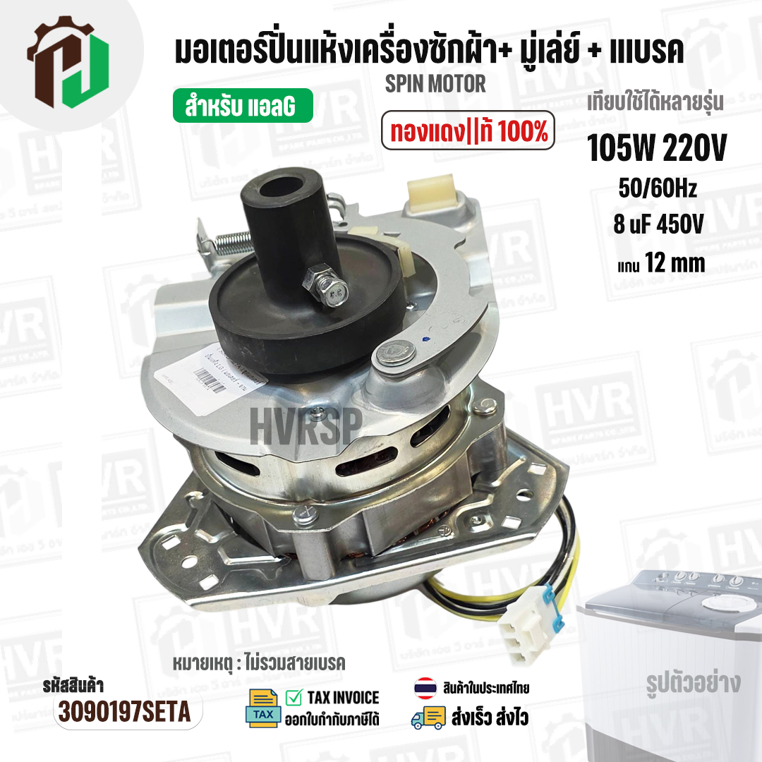 มอเตอร์ปั่นแห้งเครื่องซักผ้า LG ( แอลจี ) + มู่เลย์ยึดแกน + จานเบรค สำหรับ 9.5 - 14 KG ( 105W 220V / 8 uF 450V ( ทองแดงแท้ ) #3090197SETA