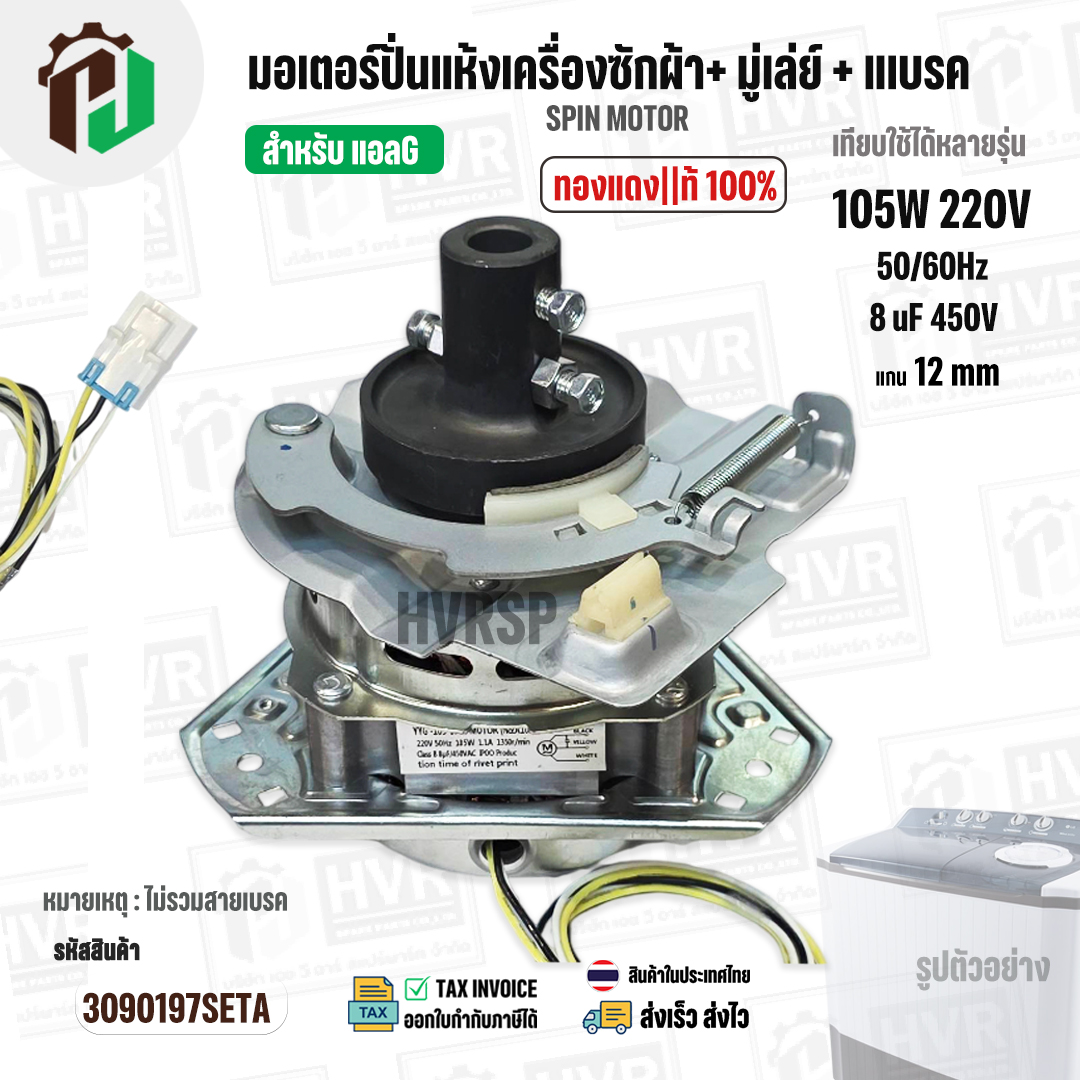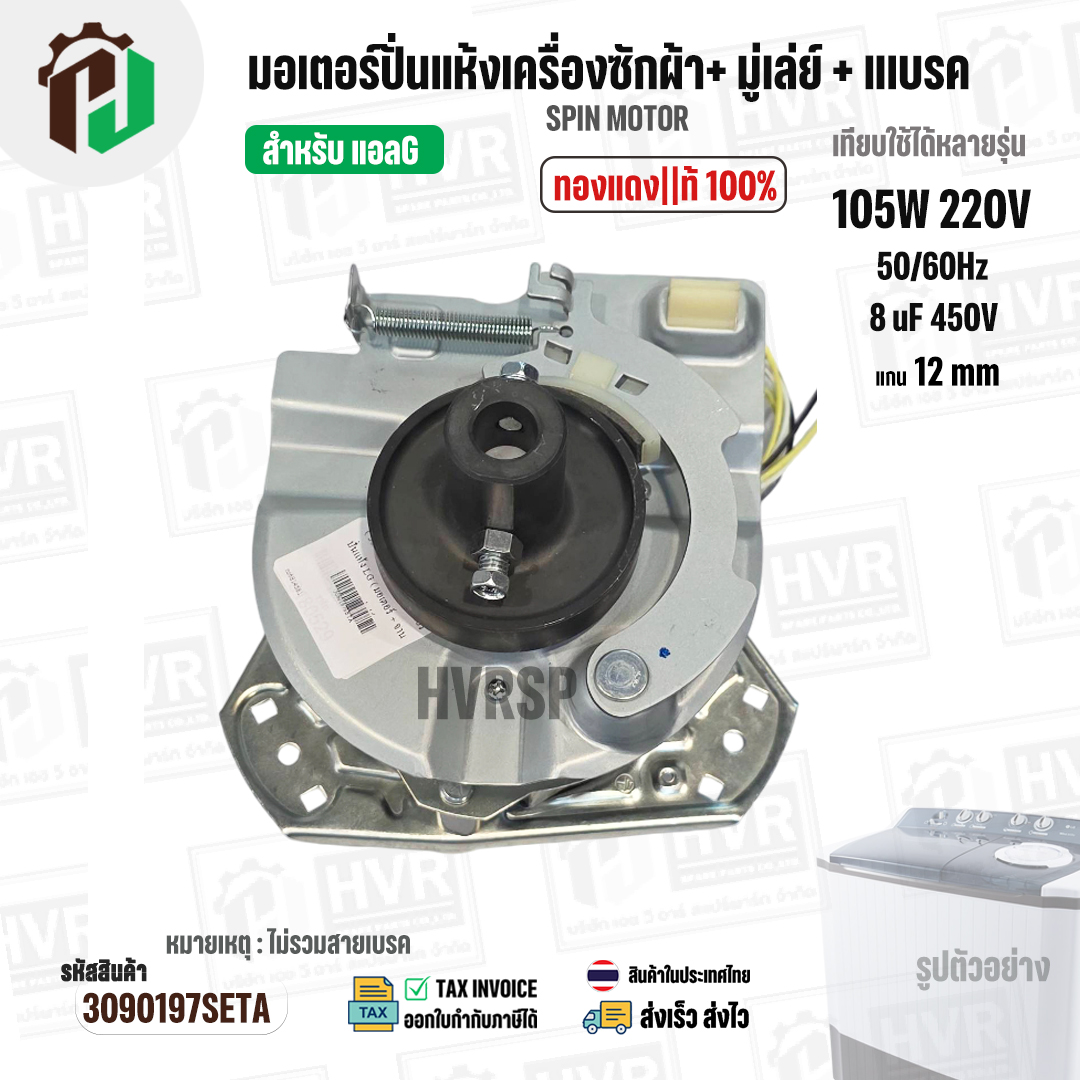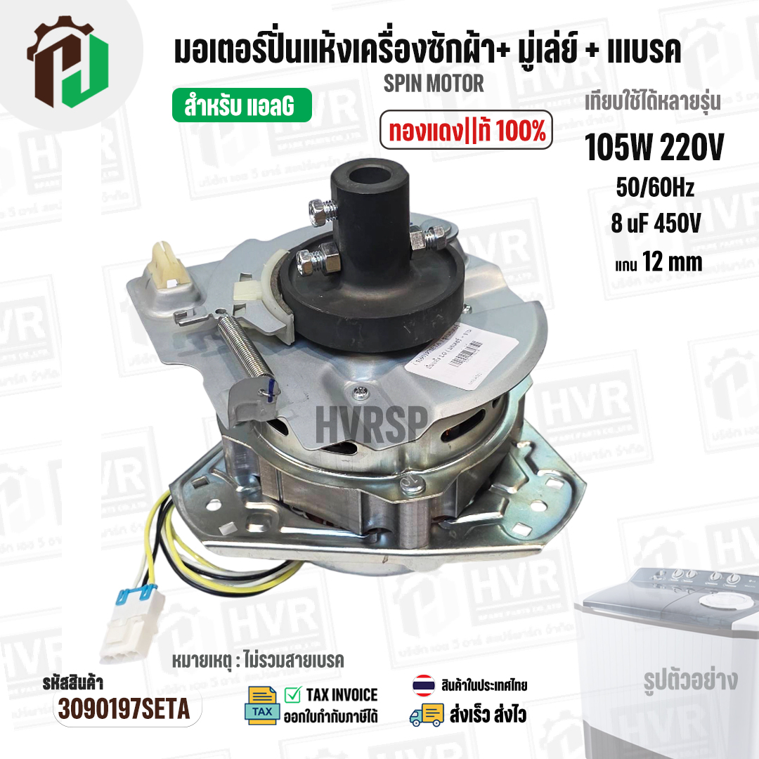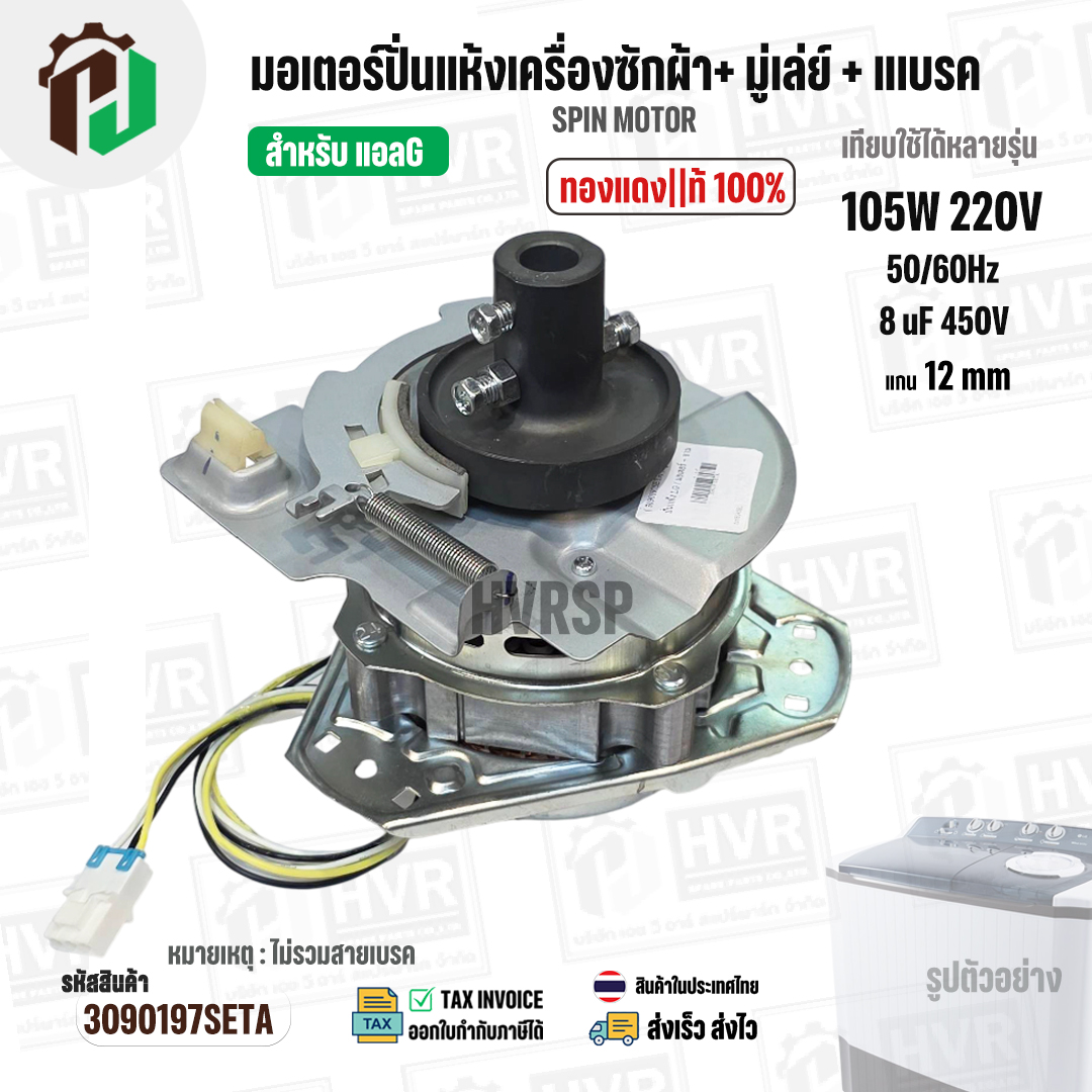 มอเตอร์ปั่นแห้งเครื่องซักผ้า LG ( แอลจี ) + มู่เลย์ยึดแกน + จานเบรค สำหรับ 9.5 - 14 KG ( 105W 220V / 8 uF 450V ( ทองแดงแท้ ) #3090197SETA