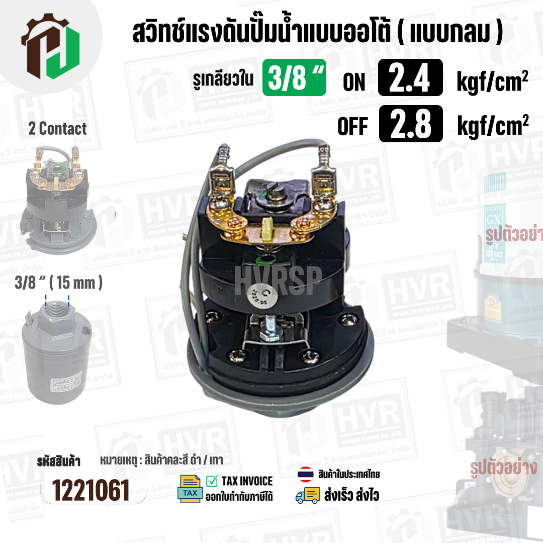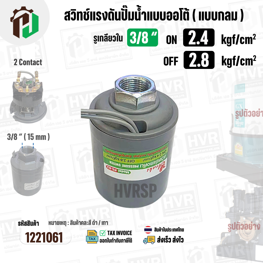 >> สวิทซ์ปั้มออโต้ แบบกลม สำหรับ MITSUBISHI , HITACHI , ITC , ทั่วไป>> ใช้กับปั้มถังอัตโนมัติ AUTO>> ON 2.4 kgf/cm2 / OFF 2.8 kgf/cm2>> รูเกลียวใน 3/8"" ( 15 mm )>> สวิทช์คอนแท็ค ตัด 2 จุด แข็งแรง คุณภาพดี