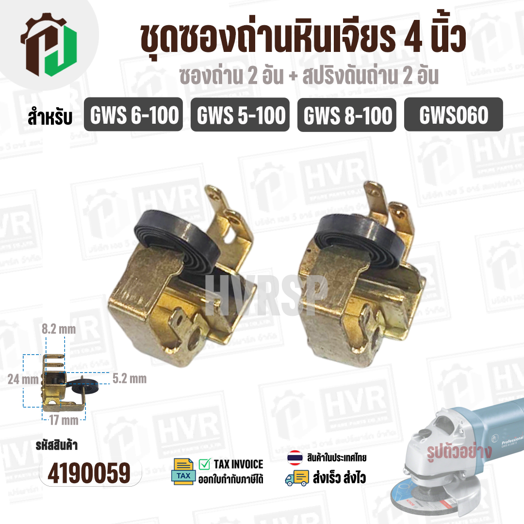 ชุดซองถ่าน + สปริงดัน หินเจียร BOSCH GWS 5-100 , GWS 6-100 , 8-100, GWS060 , GGS5000L #4190059 >> ใช้สำหรับเป็นอะไหล่ซ่อมซองถ่านหินเจียร BOSCH ( บ๊อช ) รุ่น GWS 5-100 , GWS 6-100 , 8-100, GWS060 , GGS5000L >> ในชุดมี 1. ซองถ่าน 2 อัน 2. สปริงดันถ่าน 2 อัน