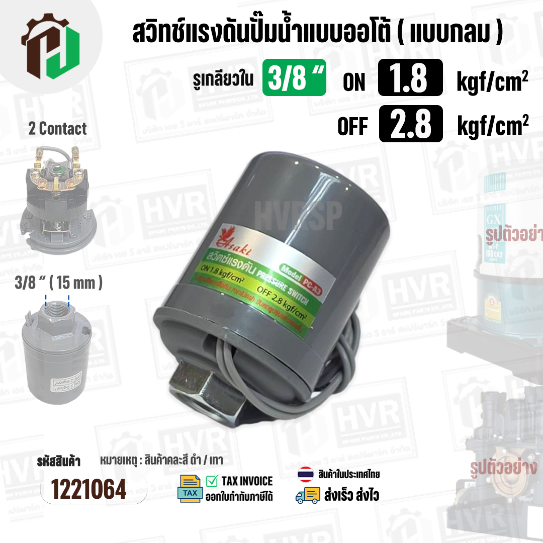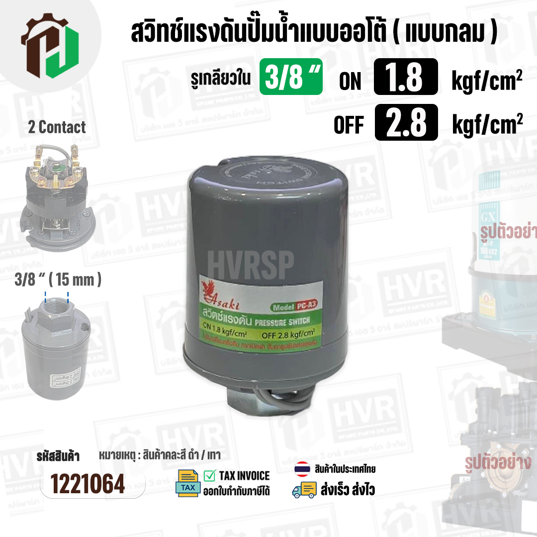 > อะไหล่ปั้มน้ำไฟฟ้า > สวิทซ์ปั้มน้ำ > สวิทซ์ปั้มน้ำออโต้ ( แบบกลม ) ON 1.8 kgf/cm2 / OFF 2.8 kgf/cm2 รูเกลียวใน 3/8" ( 2 Contact ) ( Asaki ) #H
