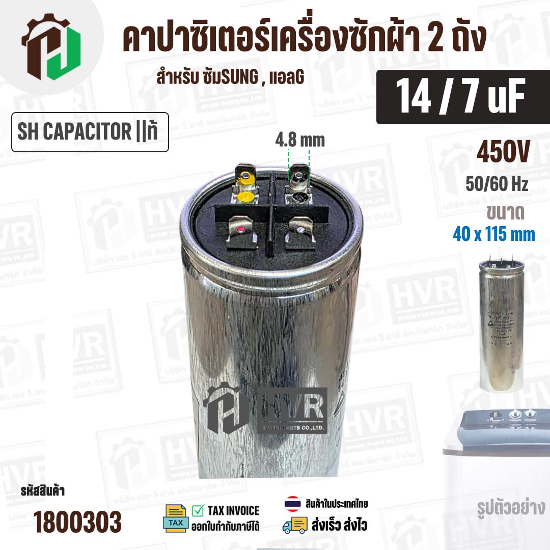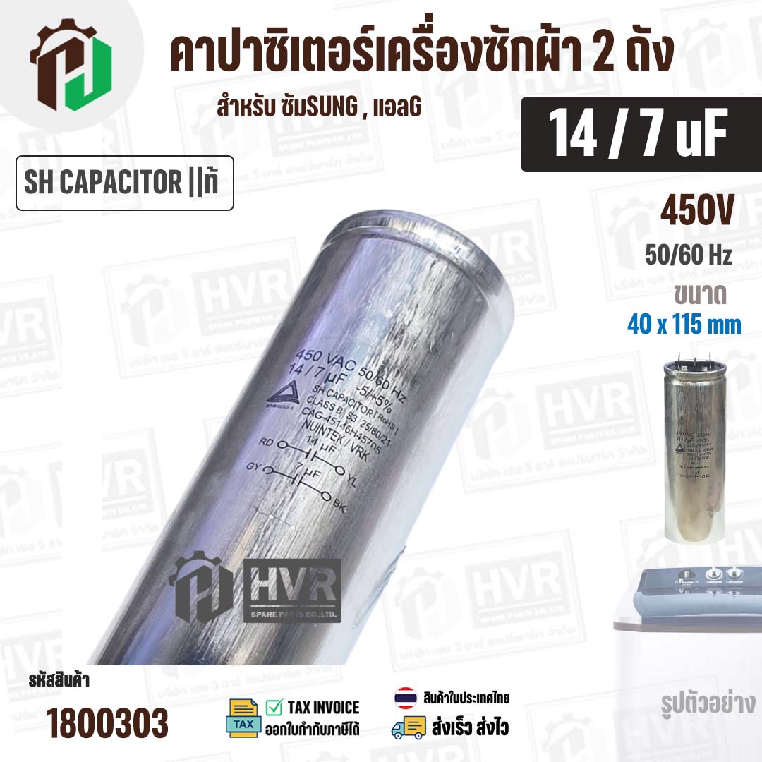 คาปาซิเตอร์เครื่องซักผ้า 14 / 7 uF 450V ( SH CAPACITOR )( อลูมิเนียม กลม เสียบ) ( 40 x 115 mm ) ( แท้ ) #1800303