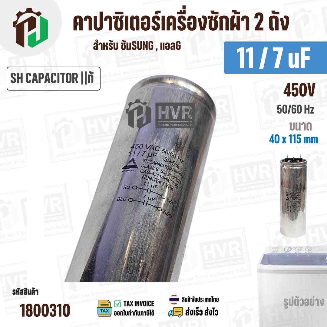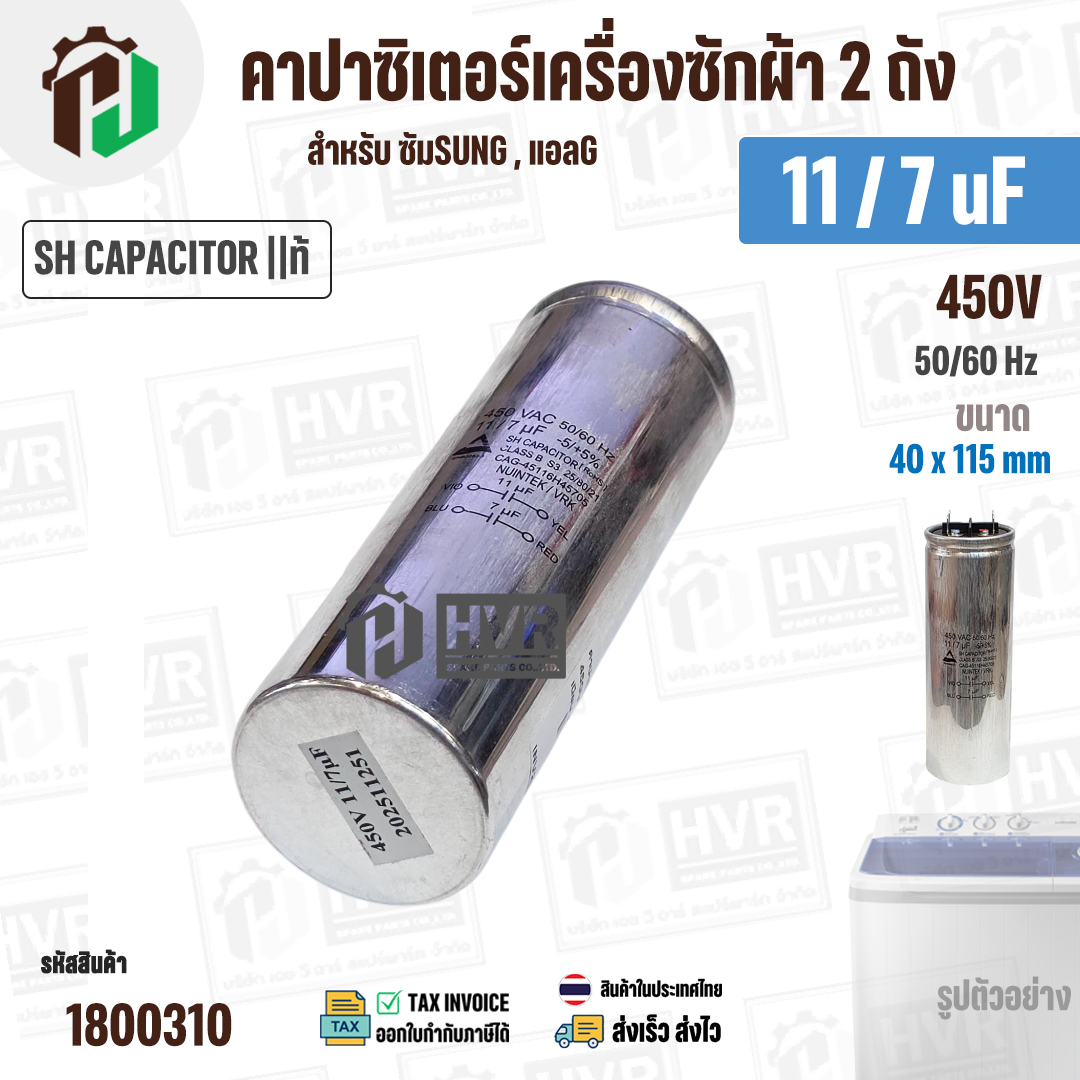 คาปาซิเตอร์เครื่องซักผ้า 11 / 7 uF 450V ( SH CAPACITOR )( อลูมิเนียม กลม เสียบ) ( 40 x 115 mm ) ( แท้ ) #1800310
