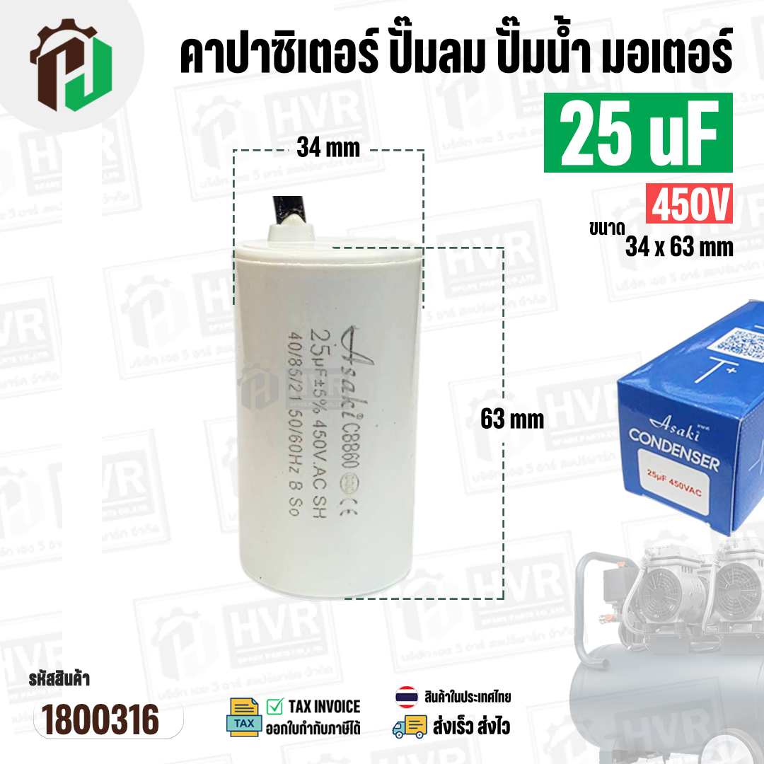 > อะไหล่มอเตอร์ > คาปาซิเตอร์ (RUN ) > คาปาซิเตอร์ปั้มลม ( Cap Run ) 25 uF 450V ( กลม สาย ) ( Asaki ) ( ตัวเล็ก ) ( 34 x 63 mm ) CBB60